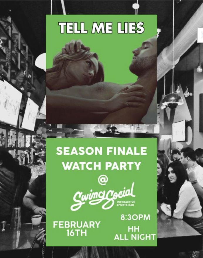 Raise a glass to lies and last episodes with Swing Social’s ‘Tell Me Lies’ Season Finale Watch Party on Friday, February 16 from 8:30-10:30pm! Enjoy a drama-filled night fueled by Happy Hour specials running all night long, inlcuidng $6 Draft Beer and $8 Well Cocktails. Catch the season finale episode projected on the large game simulator screens, making this the ultimate viewing experience. Kick back, sip, and enjoy the finale with discounted drinks, good company, and the ideal space to settle in for the juicy evening!