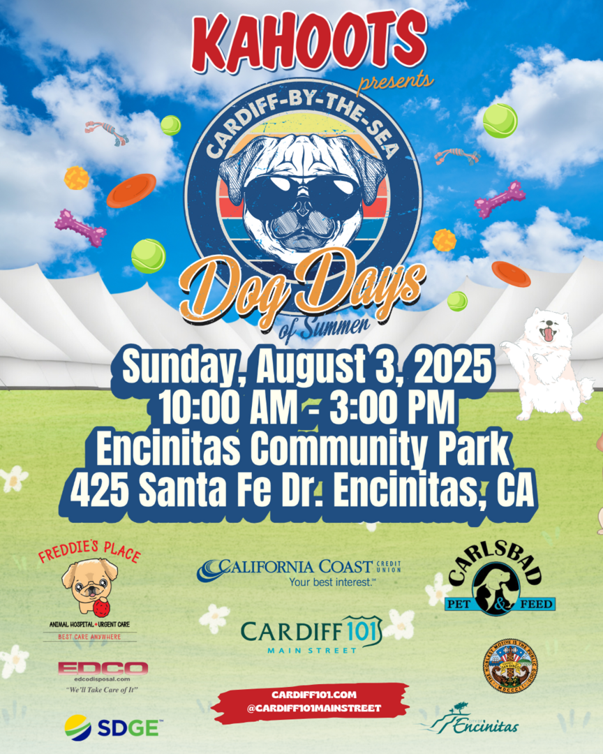 Cardiff Dog Days of Summer is hosted by Cardiff 101 Main Street and the City of Encinitas. This free event is sponsored by Kahoots and open to the public and features dog-related vendors, rescue groups, and pet adoption agencies. Activities include dog contests, live music, a libation lounge (ticketed), food trucks, and more!