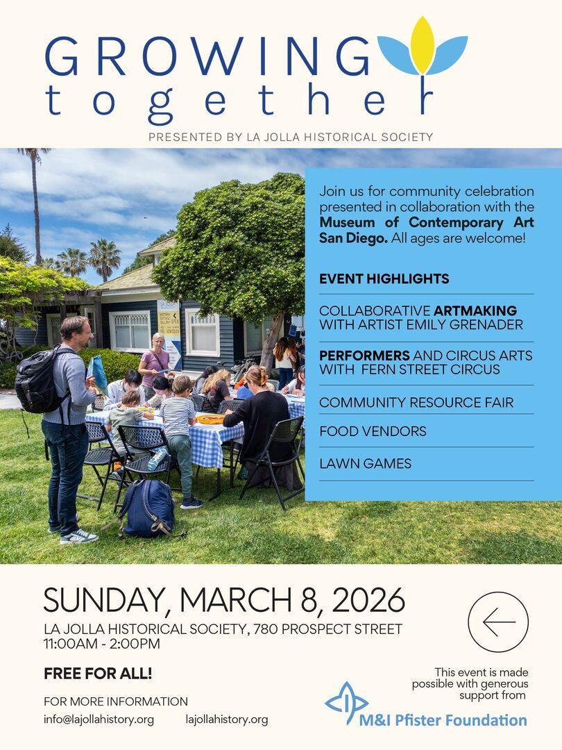 The La Jolla Historical Society (LJHS) invites families from across San Diego to enjoy a day of creativity and community at the launch of their new family event series, Growing Together. The inaugural event takes place on Sunday, March 8, from 11 a.m. to 2 p.m., expanding LJHS’s popular Family Day / Play Day in partnership with the Museum of Contemporary Art San Diego (MCASD).