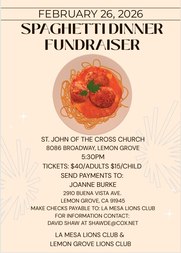 The La Mesa and Lemon Grove Lion Clubs, invite the community to enjoy a delicious evening of food, fellowship, and service at a Spaghetti Dinner Fundraiser on Thursday, February 26, 2026, at St. John of the Cross Church, located at 8086 Broadway, Lemon Grove.