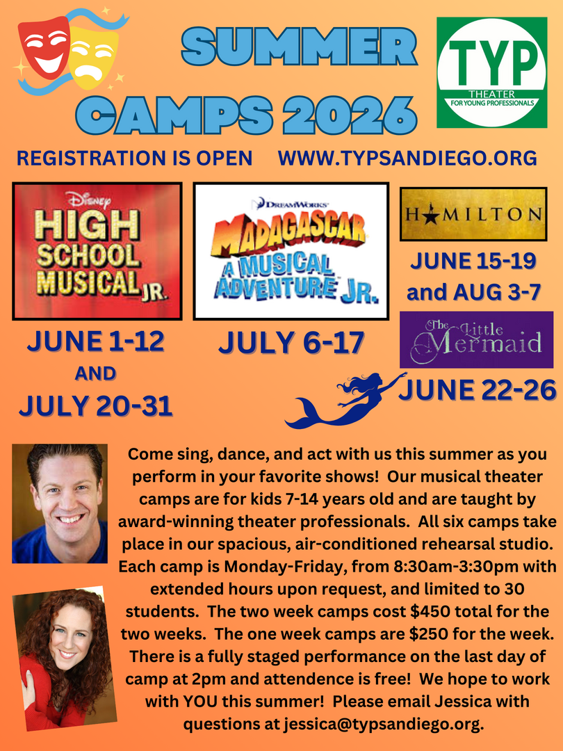 Come sing, dance, and act with us this summer as you perform in your favorite shows! Our musical theater camps are for kids 7-14 years old and are taught by award-winning theater professionals. All six camps take place in our spacious, air-conditioned rehearsal studio. Each camp is Monday-Friday, from 8:30am-3:30pm with extended hours upon request, and limited to 30 students. The two week camps cost $450 total for the two weeks. The one week camps are $250 for the week. There is a fully staged performance on the last day of camp at 2pm and attendence is free! We hope to work with YOU this summer! Please email Jessica with questions at [email protected]. 6/1-6/12 High School Musical Jr; 6/15-/6/19 Hamilton; 6/22-6/26 The Little Mermaid; 7/6-7/17 Madagscar Jr; 7/20-7/31 High School Musical Jr; 8/3-8/7 Hamilton