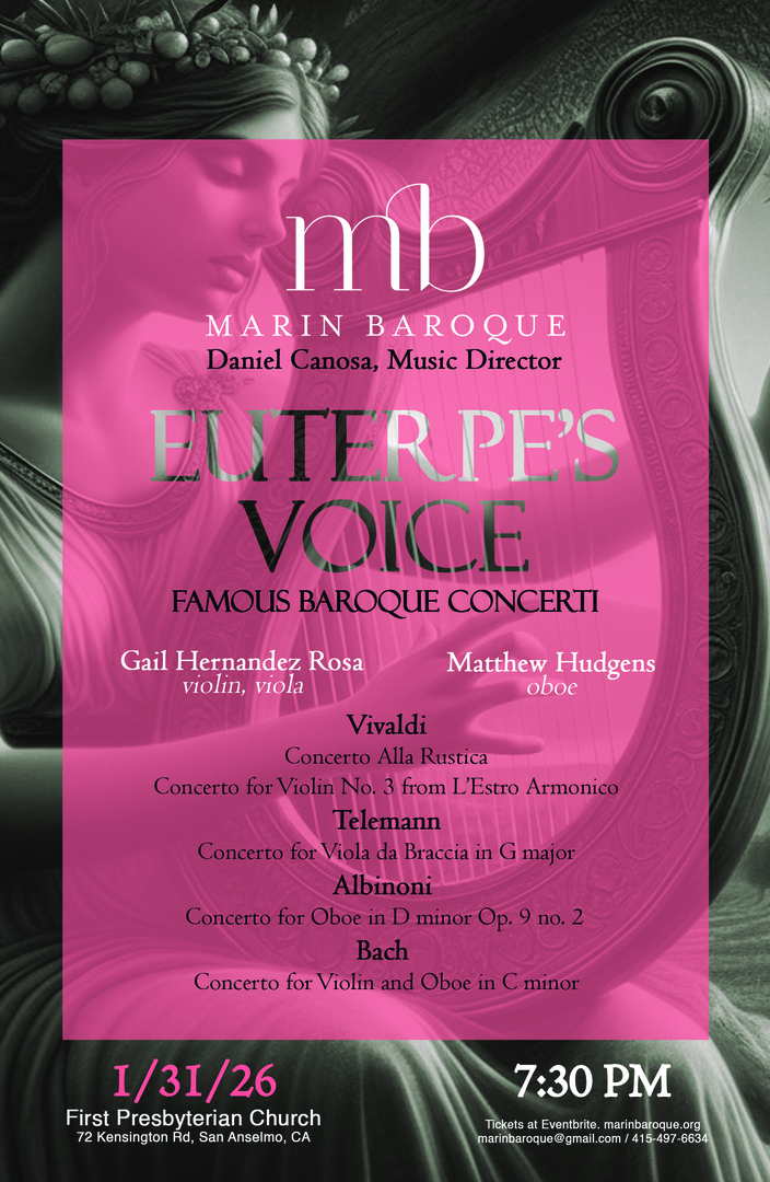 Marin Baroque under the baton of Music Director Daniel Canosa presents famous Baroque concerti by Bach, Albinoni, Vivaldi, and Telemann. Join us for famous concerti by Bach, Albinoni, Telemann, and Vivaldi featuring soloists Gail Hernández Rosa (violin and viola) and Matthew Hudgens (oboe) with the Marin Baroque period instrument orchestra. Complimentary wine reception follows the concert.