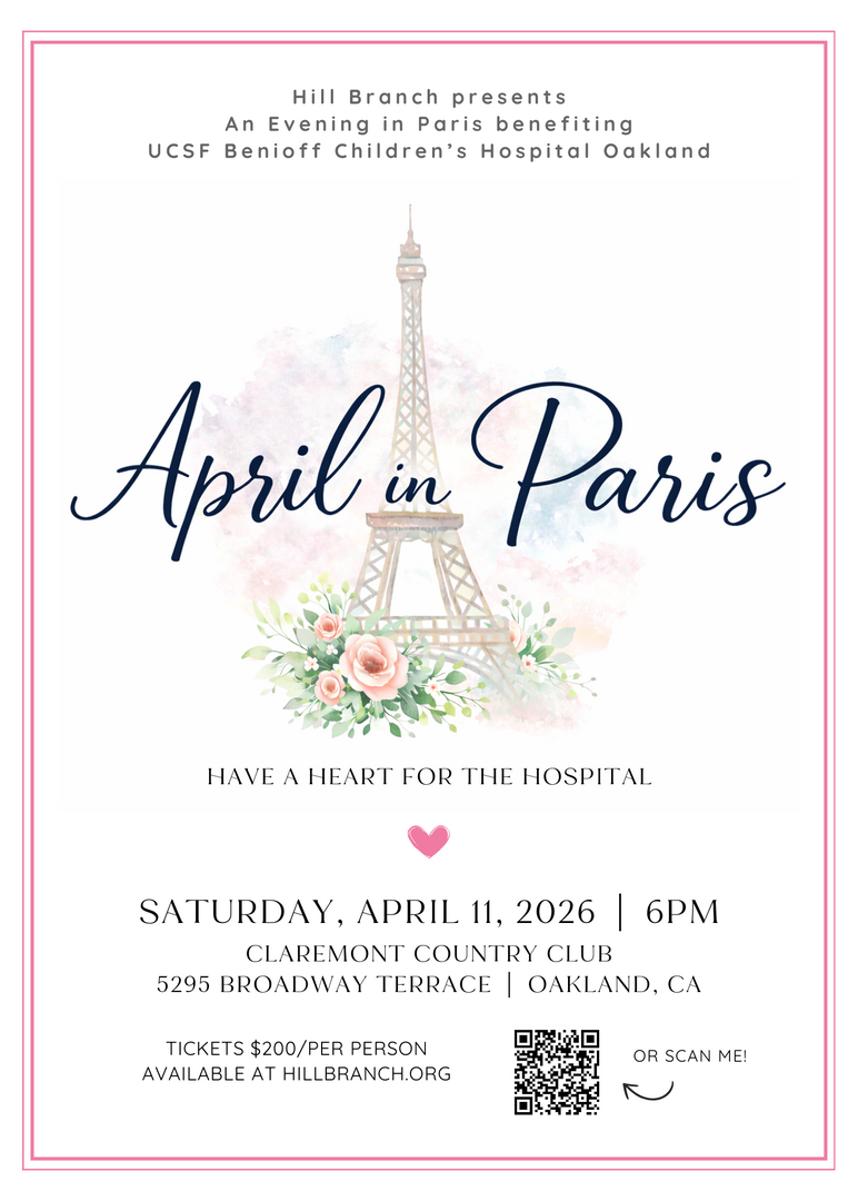 On April 11 at 6 PM, Hill Branch will host "April in Paris," a special fundraiser benefiting UCSF Benioff Children’s Hospital Oakland. The evening will take place at Claremont Country Club and promises a festive Parisian-inspired celebration supporting critical pediatric care and programs that serve children and families throughout our community.