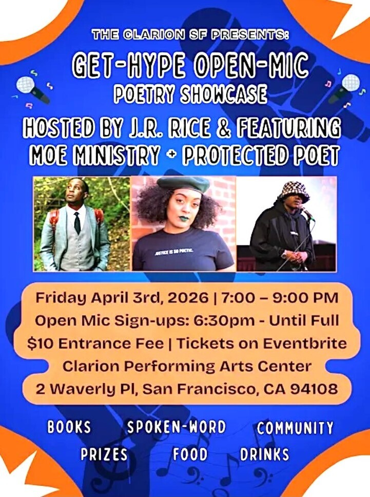 GET READY TO GET-HYPE San Francisco!!!! Clarion SF Presents: Get-Hype Open-Mic Poetry Showcase hosted by Oakland-raised author & poet J.R. Rice (@imjrice) on Friday 4/3/26 from 7-9pm.
