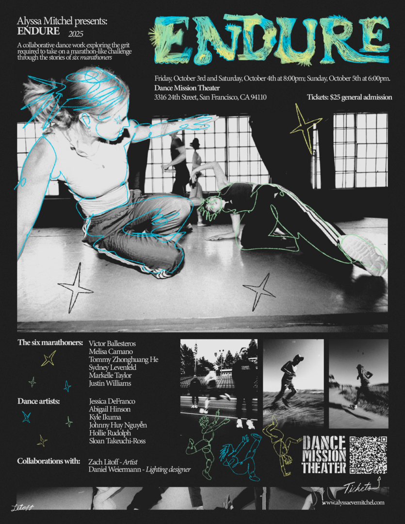 Alyssa Mitchel presents the premiere of Endure, a multimedia dance production featuring a cast of six dancers along with graphic designs and animations by Zach Litoff. The work explores the physical and mental grit required to take on any marathon-like challenge. Through the stories of six marathon runners, the piece celebrates running while paying tribute to the enduring human spirit, with the intention of empowering audience members to persevere through difficult challenges.