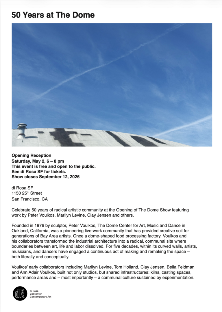 Founded in 1976 by sculptor Peter Voulkos, The Dome Center for Art, Music and Dance in Oakland, California, was a pioneering live-work community that has provided creative soil for generations of Bay Area artists. Once a dome-shaped food processing factory, Voulkos and his collaborators transformed the industrial architecture into a communal site where boundaries between art, life and labor dissolved. For five decades, within its curved walls, artists, musicians and dancers have engaged a continuous act of making and remaking the space -- both literally and conceptually.