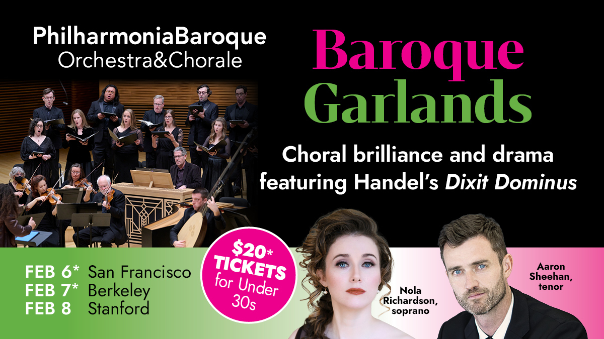 Baroque specialist and former longtime Philharmonia Baroque music director Nicholas McGegan leads the ensemble from the harpsichord, bringing his trademark infectious energy and flair for drama to this program. Rising stars Nola Richardson (soprano) and Aaron Sheehan (tenor) join forces with the Chorale. Richardson has been praised by The Washington Post for her “radiant” singing, while The New York Times hailed Sheehan as “superb.”