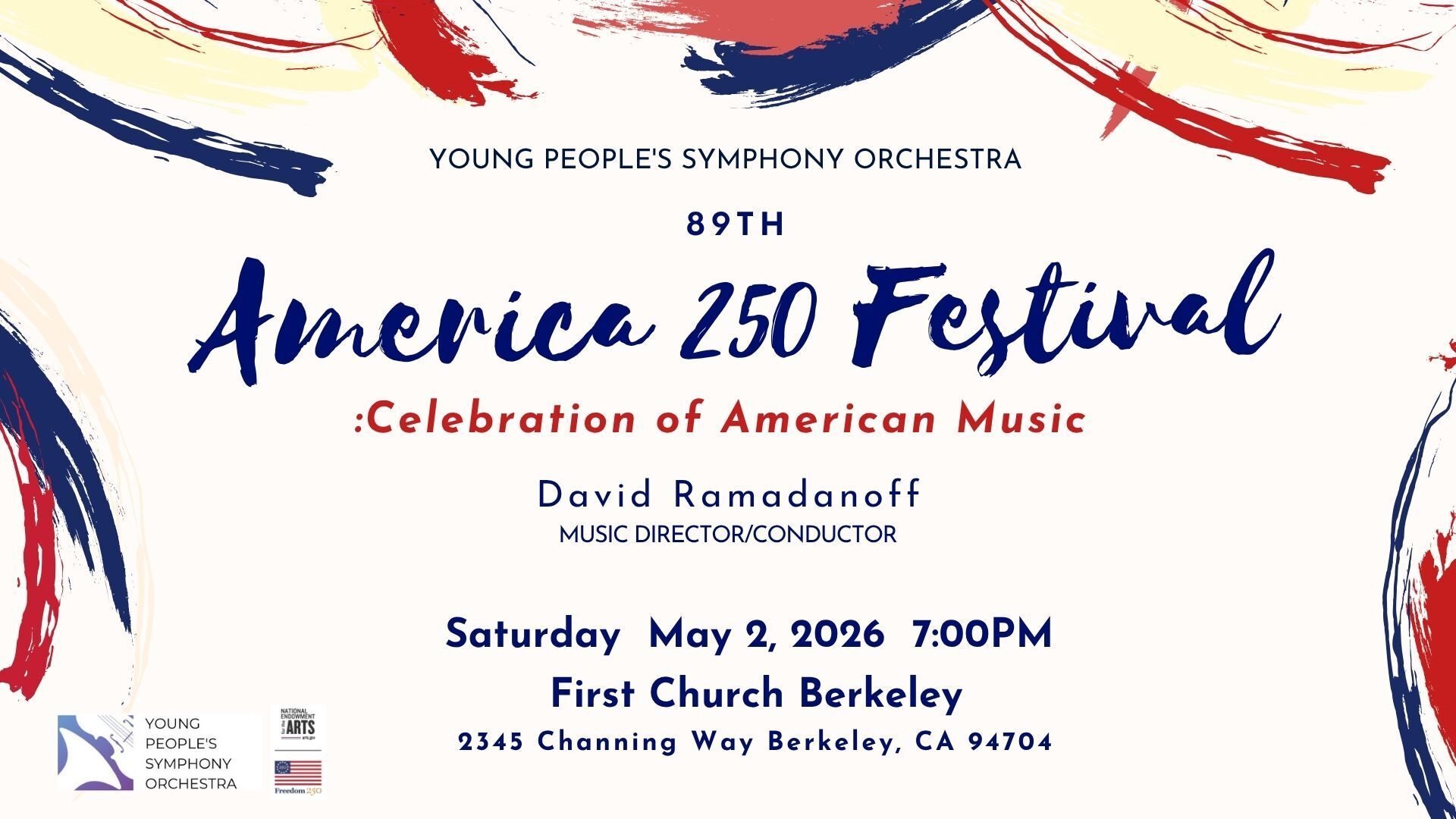 Young People’s Symphony Orchestra presents the America 250 Festival: Celebration of American Music, a special Spring Concert commemorating the 250th anniversary of the United States. This expanded festival program features a first half of chamber music performed by YPSO musicians and a second half with full orchestra—both dedicated to all-American composers—highlighting over a century of American musical voices from Aaron Copland and Leonard Bernstein to Jessie Montgomery and John Adams.