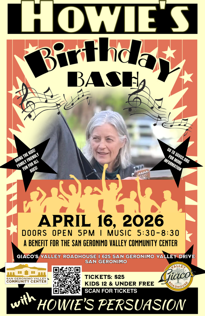 We are excited to celebrate another trip around the Sun for our beloved Howie Cort! On Thursday April 16, 2026 at 5:30pm Howie's Persuasion will Rock n Roll at Giaco's Valley Roadhouse, for this annual benefit for Arts and Events programming at the San Geronimo Valley Community Center.
