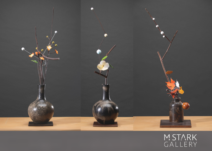 Pictured L to R: All by David Kimball Anderson “Milkweed, Seeds and Stars”, 2021, bronze, steel, paint, 42 x 13 x 9 inches; “Flower and Planets”, 2017, bronze, steel, paint, 40.5 x 9 x 9 inches; “Fall”, bronze, steel, paint, 2014, 32 x 12 x 12 inches