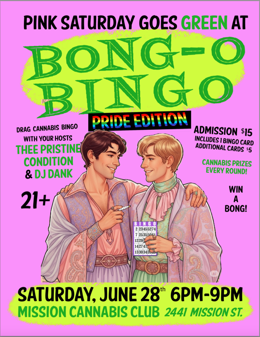 Get your drag cannabis bingo PRIDE on at BONG-O BINGO on Saturday, June 28 from 6-9pm at Mission Cannabis Club. $15/21+