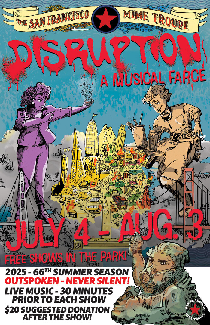 DISRUPTION - A Musical Farce features a four-person cast that includes veteran SF Mime Troupe collective members: Michael Gene Sullivan* (Hector Washington); Alicia M.P. Nelson* (Zubari Macintosh); and features Lizzie Calogero* (Elizabeth); Jed Parsario* (Augie Dimalanta).