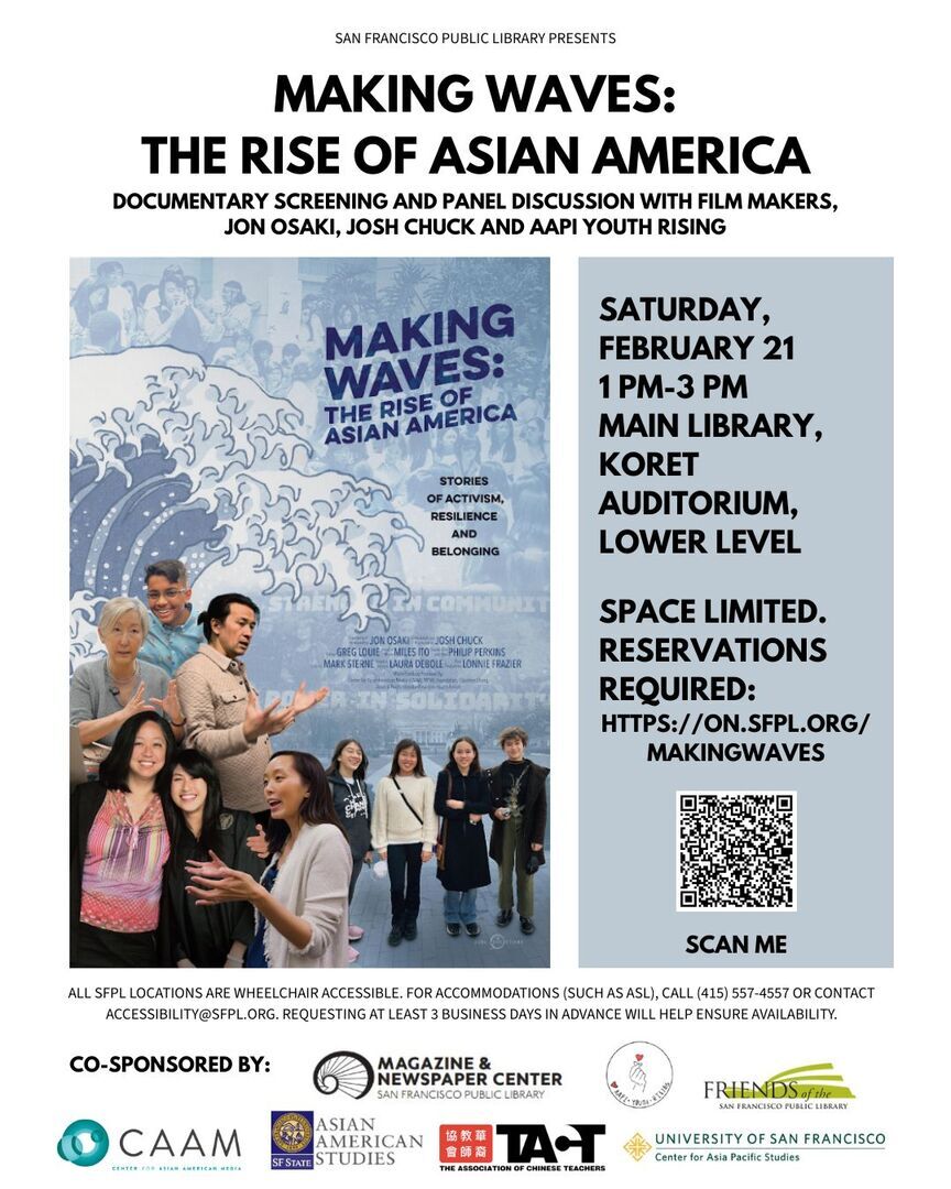 Experience Making Waves: The Rise of Asian America, a documentary film featuring youth activists and educators around the U.S. who are utilizing Asian American Studies to shape a movement. Screening is followed by a panel discussion including Making Waves co-directors, Josh Chuck and Jon Osaki, with local youth activists from AAPI Youth Rising, who are featured in the film.