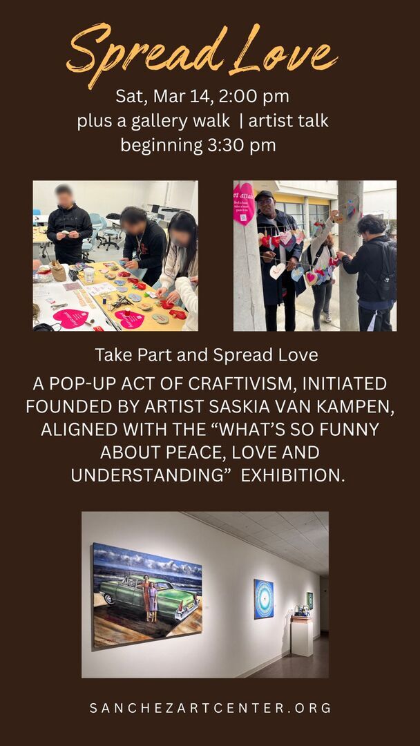 Spread Love, is a pop-up act of craftivism aligned with the “What’s So Funny About Peace, Love and Understanding” exhibition at Sanchez Art Center.