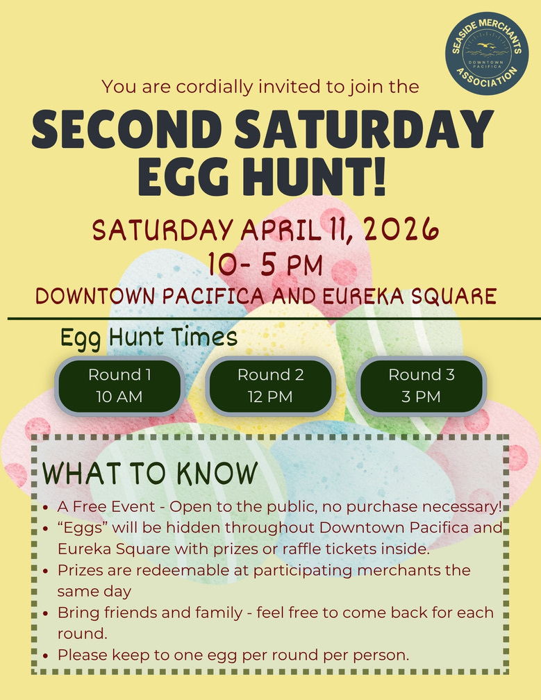 • "Eggs" will be hidden throughout Downtown Pacifica and Eureka Square with prizes or raffle tickets inside.