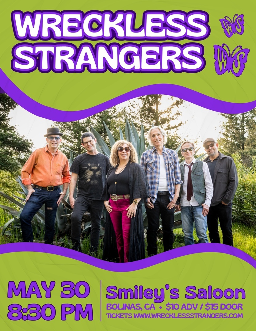 Wreckless Strangers is a collective of friends and musicians carrying the torch for San Francisco’s grand rock ‘n’ roll tradition. Their unique blend of “Ameri-Cali Soul” melds the contemporary blues stylings of Bonnie Raitt and Boz Scaggs; the songwriting sensibilities of Sons of Champlin and Fleetwood Mac; the swashbuckling Americana of the Lost Planet Airmen and Peter Rowan; and the funk of Sly Stone and Tower of Power with a dash of Grateful Dead and Jefferson Airplane for flavor and unpredictability. With soaring vocal harmonies and burning instrumental improvisation, framed by concise, poignant original songwriting, Wreckless Strangers seek to honor and carry forth the brand of free-spirited musical fun and adventure that defines the Bay Area.