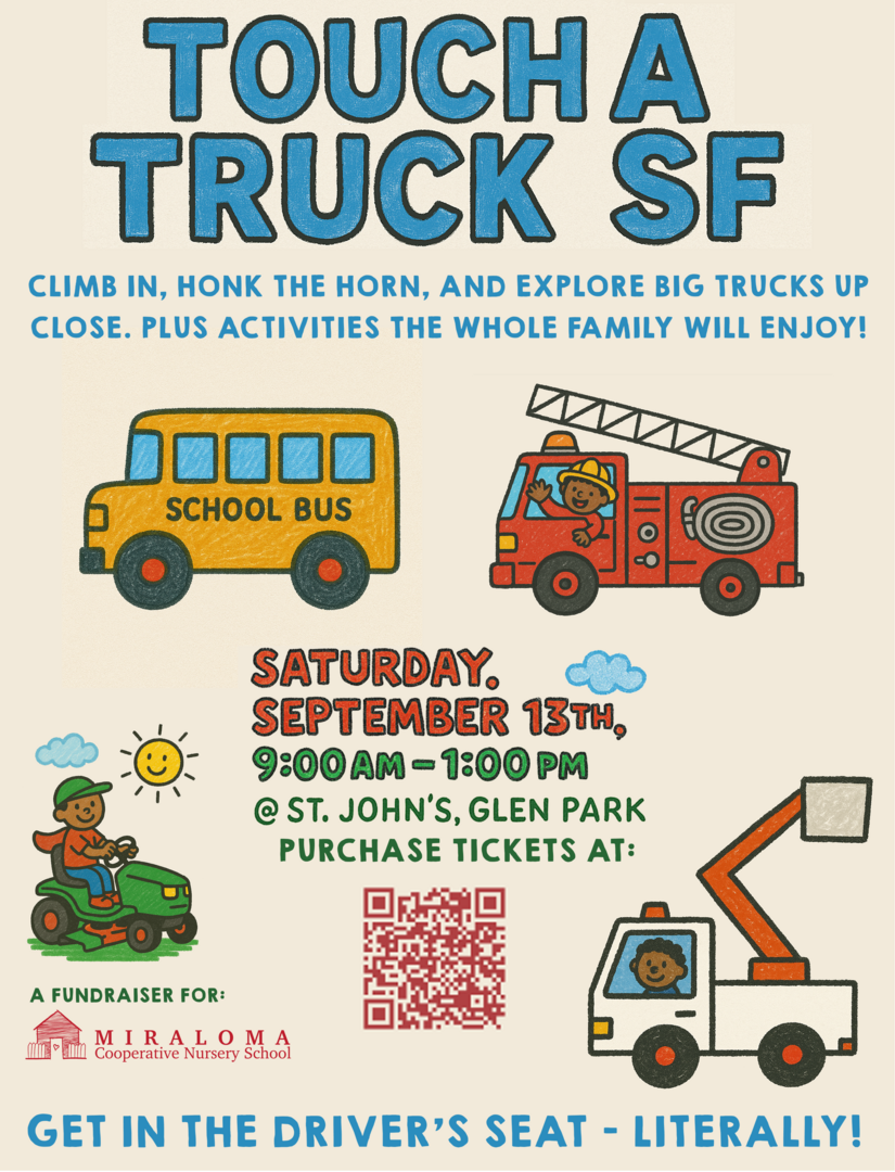 Welcome to Touch a Truck SF, our second annual fundraiser for Miraloma Cooperative Nursery School. At the event, kids get hands on experience to sit in the seat, honk the horn, pretend to drive, and get up close and personal with your favorite vehicles, including: