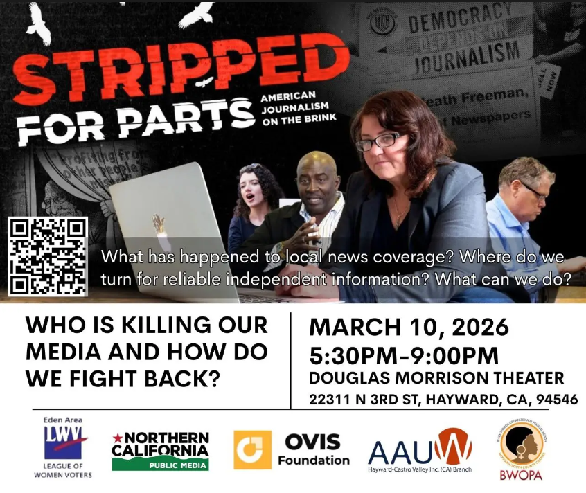 This event is sponsored by: Northern California Public Media, Ovis Foundation, AAUW Hayward Castro Valley Branch, BWOPA Hayward South County Chapter, and League of Women Voters Eden Area.