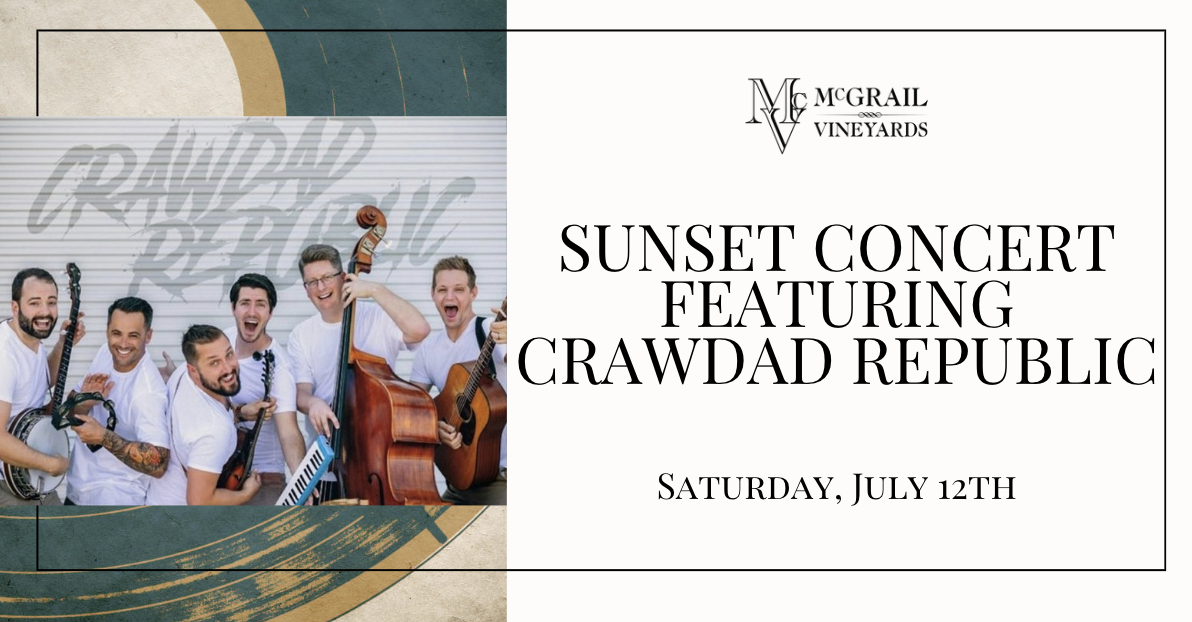 Kick off summer with an unforgettable evening at McGrail Vineyards! Gather your family and friends for a lively outdoor concert featuring hometown favorites, Crawdad Republic. With their signature blend of folk and bluegrass, rich harmonies, and feel-good melodies, Crawdad Republic is sure to get you dancing! A beloved staple of the Livermore music scene, some even call them 'the sound of Livermore.' Don’t miss this family-friendly night of music, fun, and summer vibes!