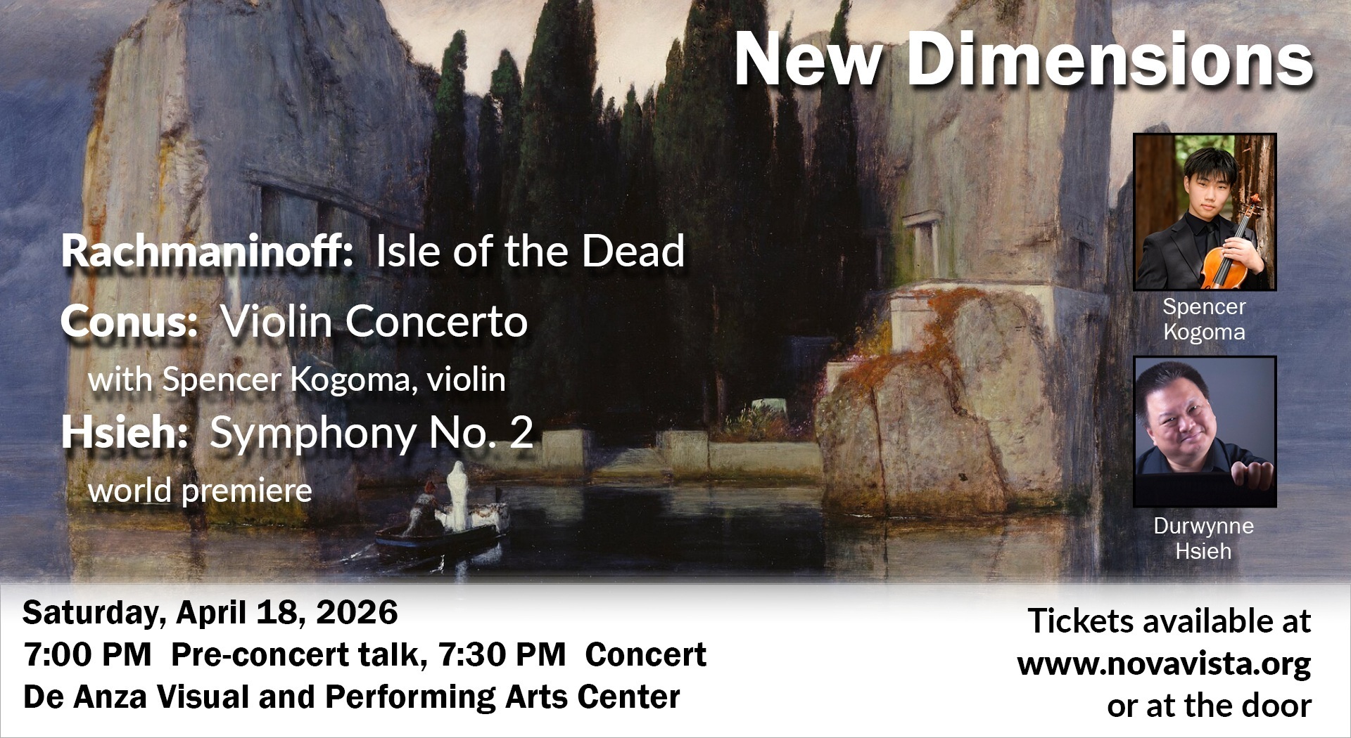 For the first time in our 60 year history, Nova Vista Symphony has commissioned a full symphony. Come hear the world premiere of our Symphony No. 2 by our composer in residence, Durwynne Hsieh. Also on the program is Rachmaninoff's haunting tone poem, Isle of the Dead, and the 2025 winner of the Nova Vista Symphony Mary Jane Beck Concerto Competition, Spencer Kogoma, in the rarely heard but astonishingly beautiful Conus Violin Concerto. Preconcert talk at 7:00 pm