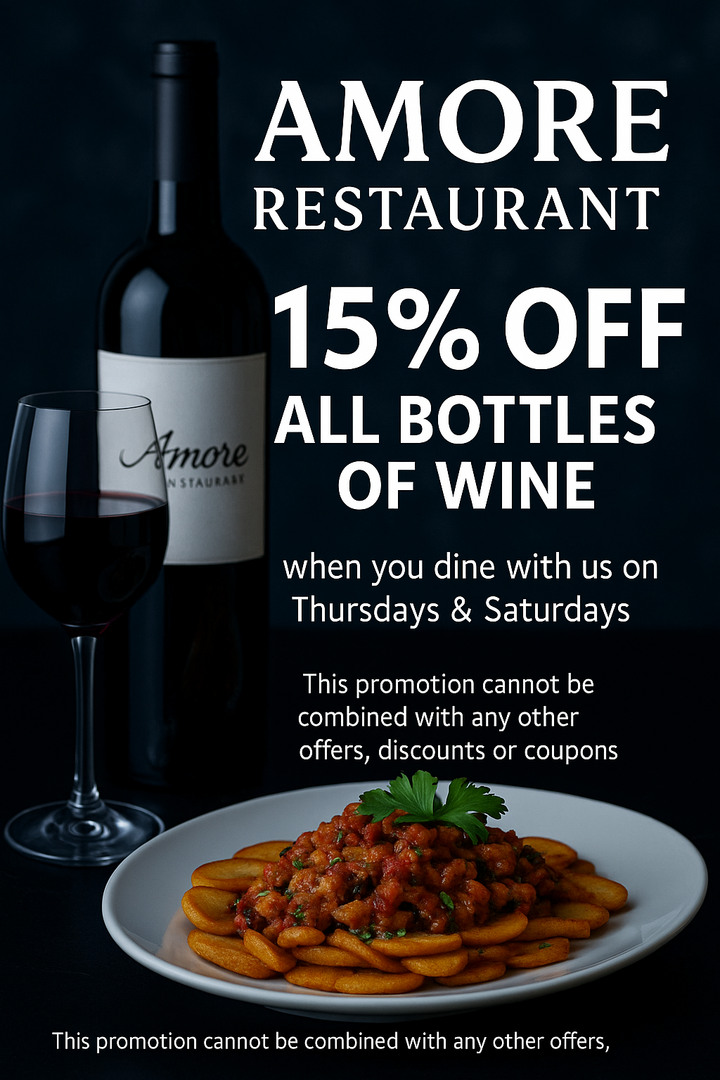 Celebrate with π·β¨ Celebrate at Amore with something truly special! Enjoy 15% off all bottles of wine when you dine with us. Whether you're indulging in our authentic Portuguese dishes or savoring classic Italian flavors, a great bottle makes the evening even better.