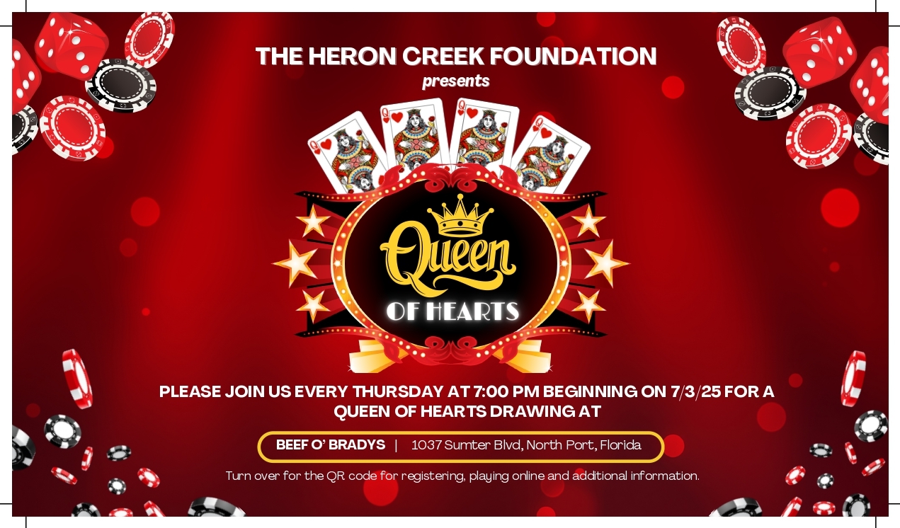 The Queen of Hearts is a weekly game of chance presented by the Heron Creek Foundation, benefiting North Port Nonprofits and Charities. Tickets are $1 each, with a minimum of 5 tickets when purchased online. At 7 p.m. every Thursday, one ticket is pulled from the ticket drum at Beef 'O' Brady's, Sumter Blvd, North Port. The owner of the drawn ticket wins $50 cash and has the opportunity to choose a remaining face-down card from the Queen of Hearts Board. If the selected card is the Queen of Hearts, the winning ticket owner receives 50% of the published jackpot (40% if not present). If the chosen card is anything but the Queen of Hearts, all tickets in the drum are discarded and the jackpot is carried over to the following week. The above process will be repeated every week until the Queen of Hearts is revealed. New tickets must be submitted every week to remain eligible for the drawing