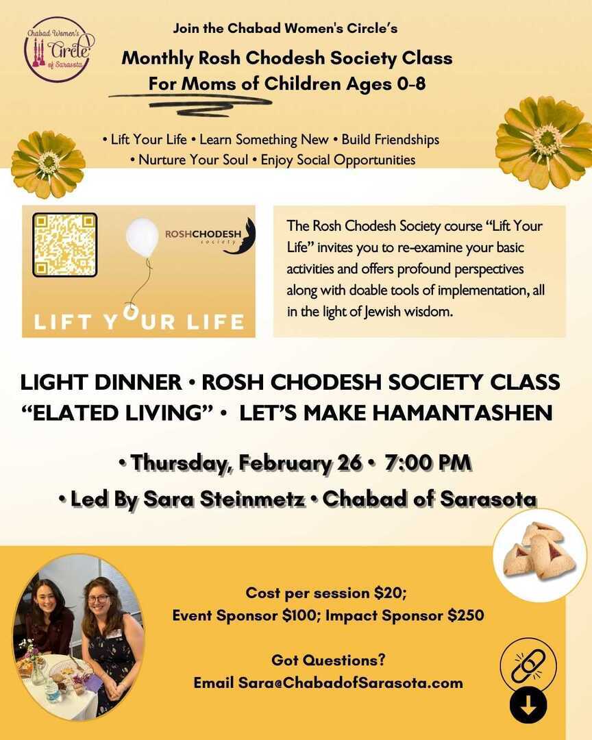 to cultivating a constantly positive outlook. Together, we’ll uncover timeless Jewish wisdom and Kabbalistic insights, paired with practical takeaways—because the best inspiration lasts. Each class offers a night out that includes a light dinner, dessert, and an opportunity to strengthen friendships. Following the class, women will enjoy making hamantashen! Join us as you take time to nurture your heart, mind, and soul.