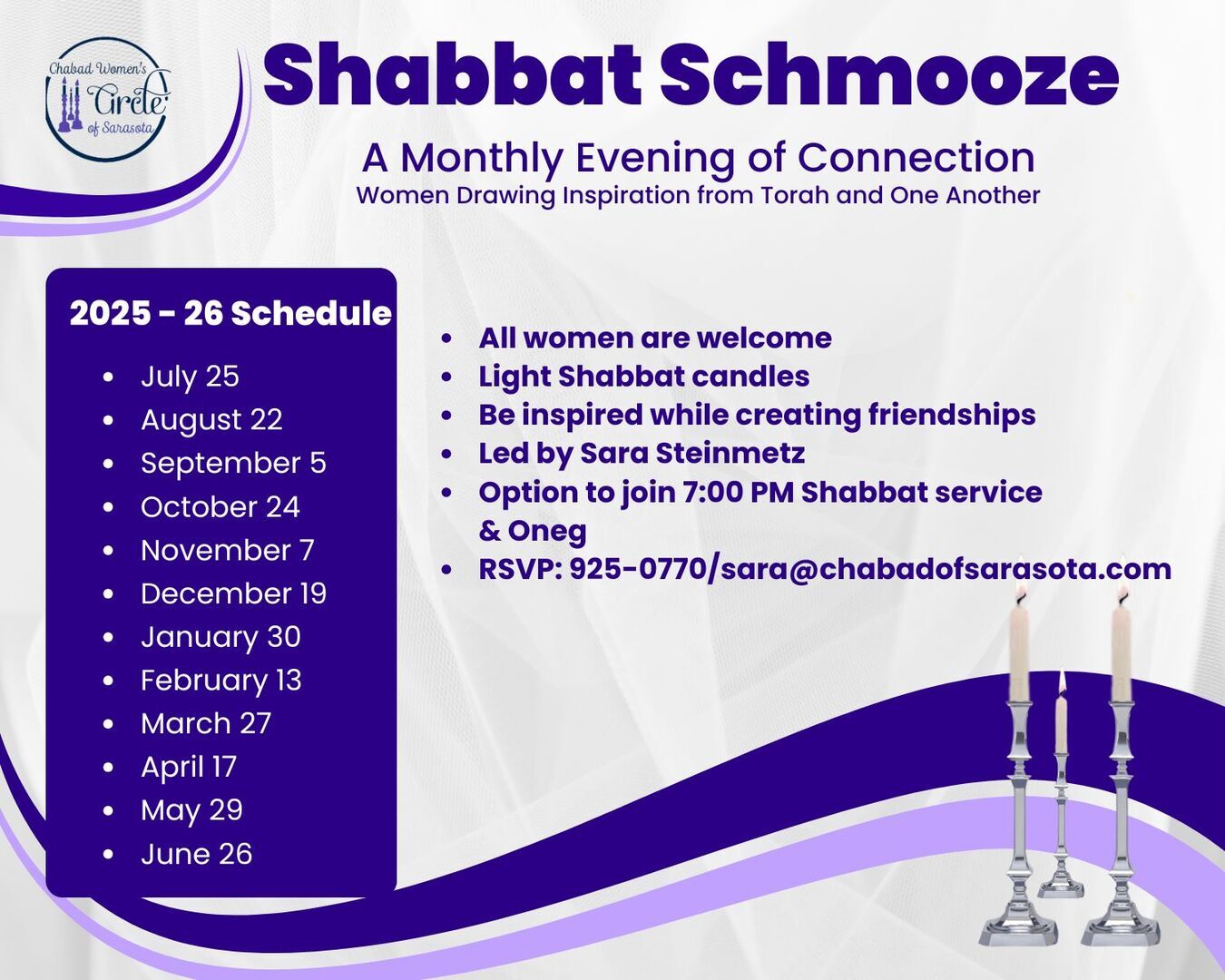 For questions or more information, email: Sara at [email protected] / Call the Chabad office at 941-925-0770.