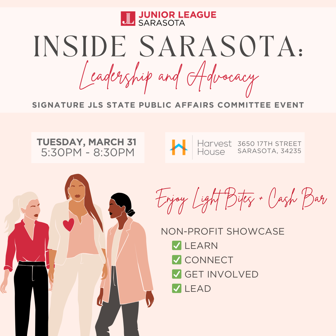 Join the Junior League of Sarasota for Inside Sarasota: Leadership & Advocacy, a free community event connecting residents with local nonprofit organizations and volunteer opportunities across Sarasota County.