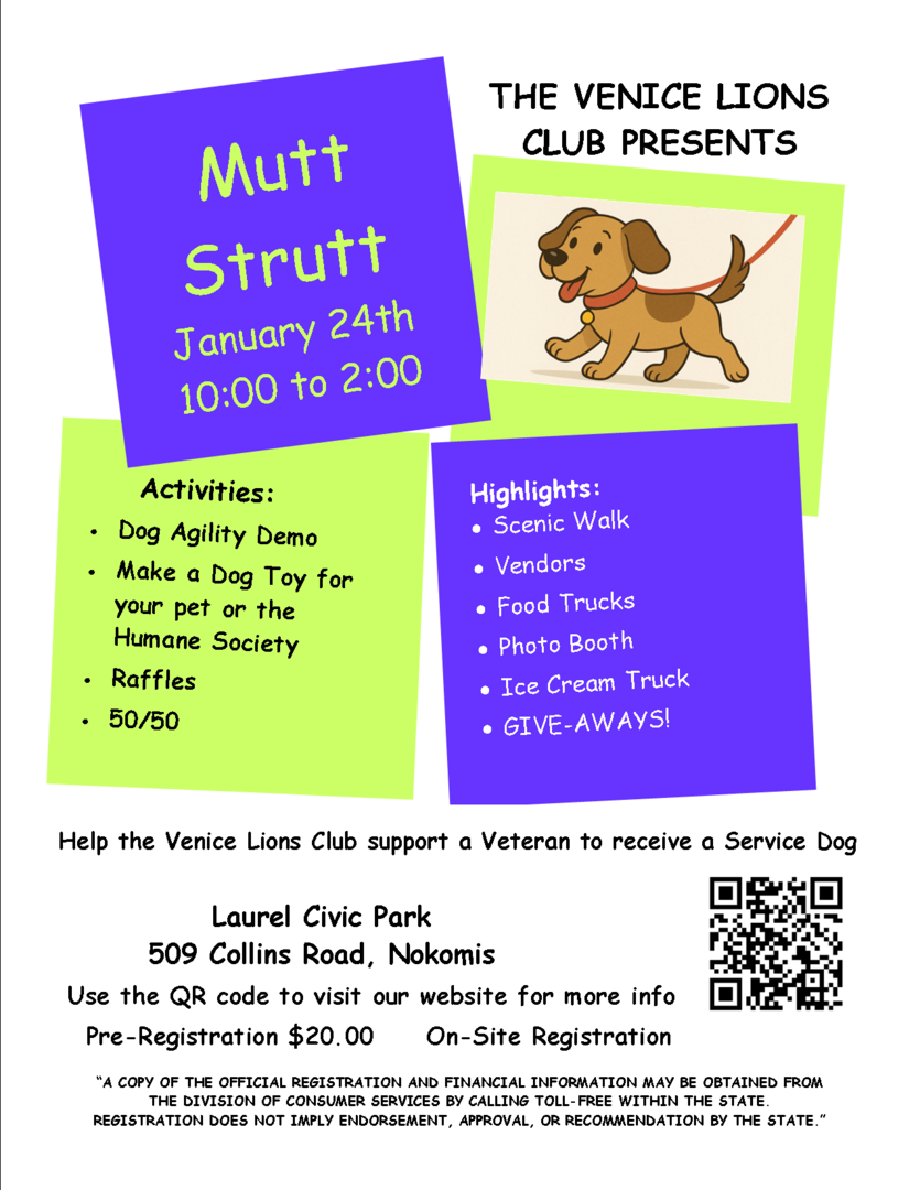 The Venice Lions Club is hosting its first MUTT STRUTT on Saturday January 24 from 10:00 – 2:00. The dog walk will be held at Laurel Civic Park, 509 Collins Rd. in Nokomis. Proceeds from the event will help support a Veteran receive a Service Dog. In addition to seeing lots of dog breeds, highlights of the scenic walk include vendors, a dog agility demo, giveaways, photo booth, ice cream and food trucks and more!