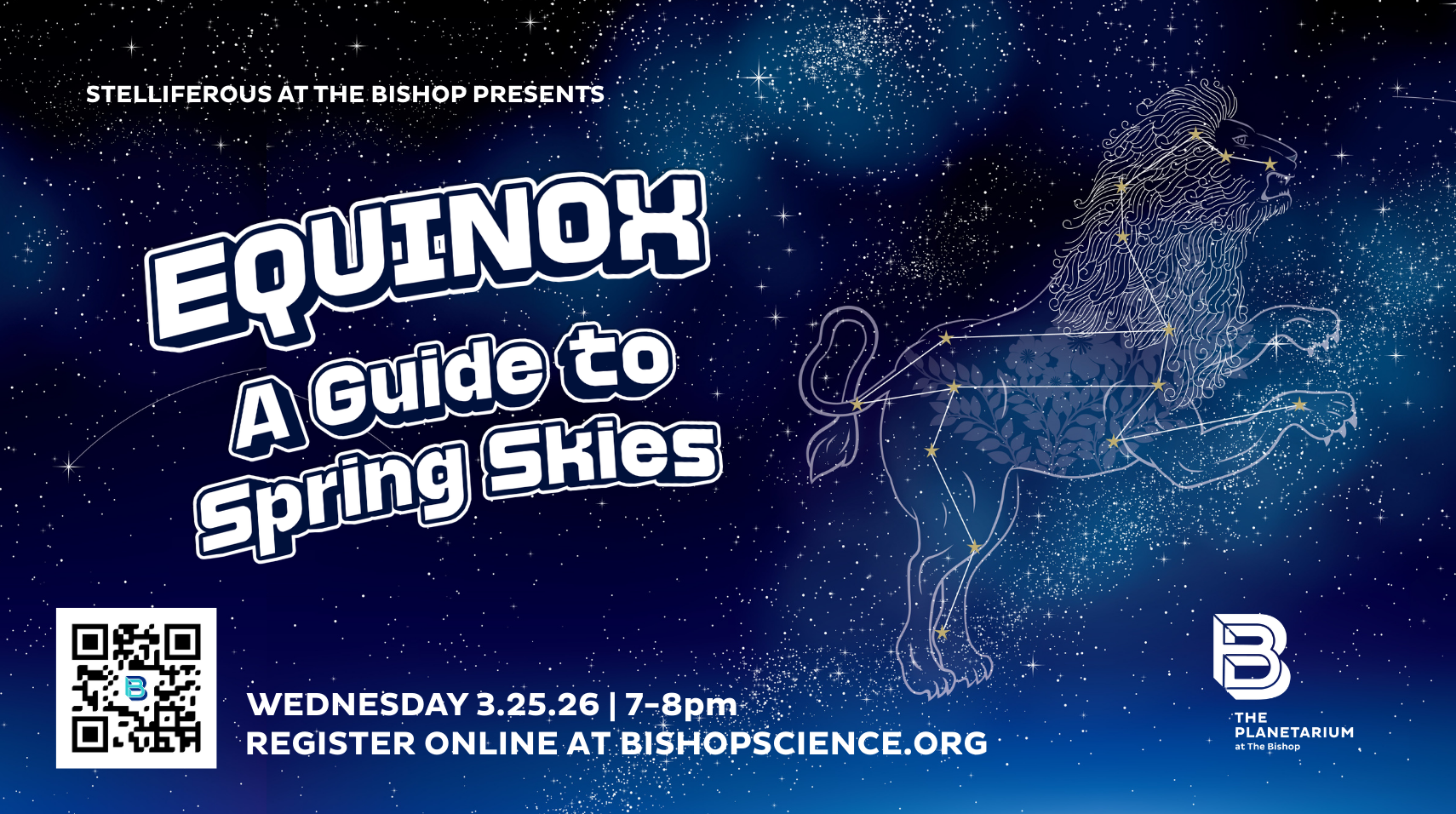 Join us in the Planetarium at The Bishop to celebrate the Vernal Equinox with a one-hour live presentation, getting to know your night sky! Explore the stories amongst the stars, learn some tips and tricks to navigating the night sky, and take a closer look at deep sky objects through the James Webb Space Telescope (JWST)!