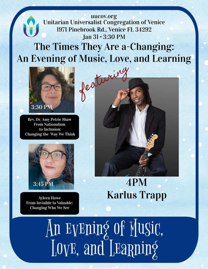 Join us for a wonderful free evening of music, love and learning. Featuring talks by Rev. Dr. Amy Petrie Shaw and Ayleen Howe from UUCOV, and an amazing music performance from Karlus Trapp.