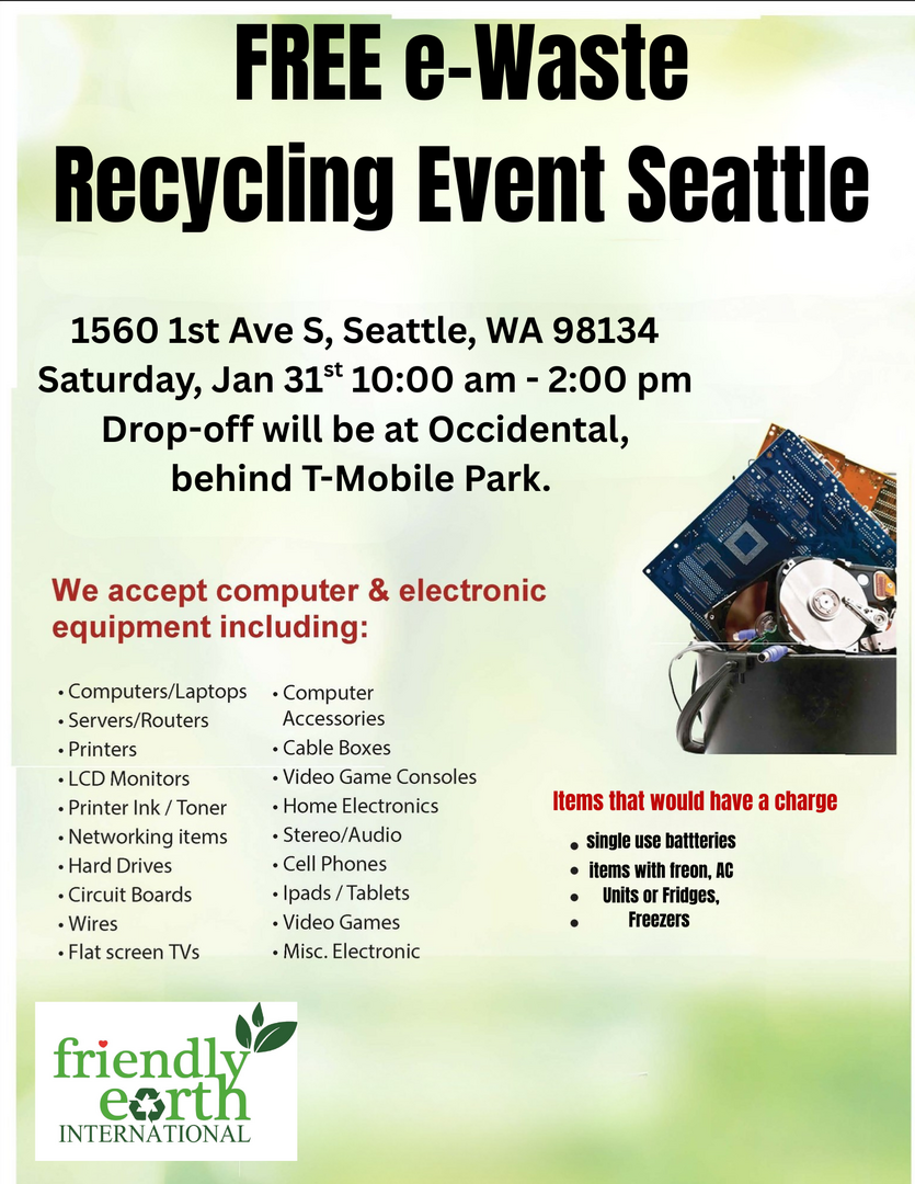Friendly Earth Int will be hosting a Free Electronic Recycling Event at our Seattle Warehouse. 1560 1st Ave S, Seattle 98134