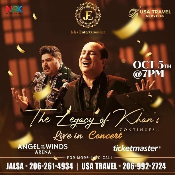 HomeEventsThe Legacy of Khans - Rahat Fateh Ali Khan Live In Seattle This Event has Passed The Legacy of Khans - Rahat Fateh Ali Khan Live In Seattle Saturday, October 05, 2024 6:00 PM - 11:00 PM 6:00 PM - 11:00 PM See all dates and Times Angel of the Winds Arena Parking Deals Get a Ride LYFT UBER Add to Calendar 10/05/2024 06:00 PM 10/05/2024 11:00 PM America/Dawson The Legacy of Khans - Rahat Fateh Ali Khan Live In Seattle The Legacy of Khans - Rahat Fateh Ali Khan Live In Seattle Event LinksTickets: https://go.evvnt.com/2624354-0 Details & Tickets: https://www.upcomingevents.com/seattle/events/angel-of-the-winds-arena/the-legacy-of-khans-rahat-fateh-ali-khan-live-in-seattle-297367?ref=uceaddevent Angel of the Winds Arena, 2000 Hewitt Avenue, Everett, WA, 98201 Set Reminder Categories Live Performance, Performing Arts Neighborhoods Bayside (Everett)Glacier View (Everett)Port Gardner (Everett)Riverside (Everett) The Legacy of Khans - Rahat Fateh Ali Khan Live In Seattle Event LinksTickets: https://go.evvnt.com/2624354-0