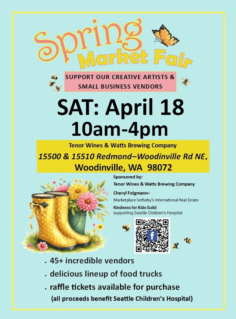 Join us on April 18th as we kick off a new season with amazing local vendors, delicious food trucks, raffle prizes, and the warm community energy that makes the Woodinville Market Fair shine. Both locations are family‐friendly and perfect for a spring day out. Vendors interested in participating — we’d love to have you. Message us for details on joining the lineup.