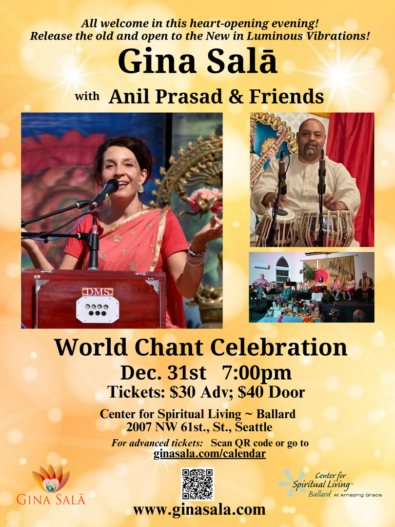 Gina will be joined by tabla maestro Anil Prasad, Robert Hinrix on bass, Aureole Lopez Schulman, Curt Rosengren and Steve Grant on response vocals. How we end and begin things makes a difference! And as co-creators, we will open to 2026 with the support of other voices amplifying the highest vibrations. You will feel more clear, uplifted, and ready to open into 2026 in this uplifting, soul-nourishing celebration. As always, come as you are, participate as you like. Dress up or down... you are beloved and welcome just as you are!