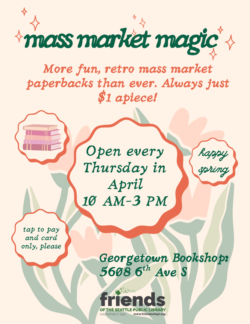 The Friends of The Seattle Public Library has more mass market paperbacks than ever. Visit us every Thursday in April, 10 AM to 3 PM, to peruse and shop. Mass market titles are always just $1! Most other books run $2–4, with special finds and signed volumes starting at $7.