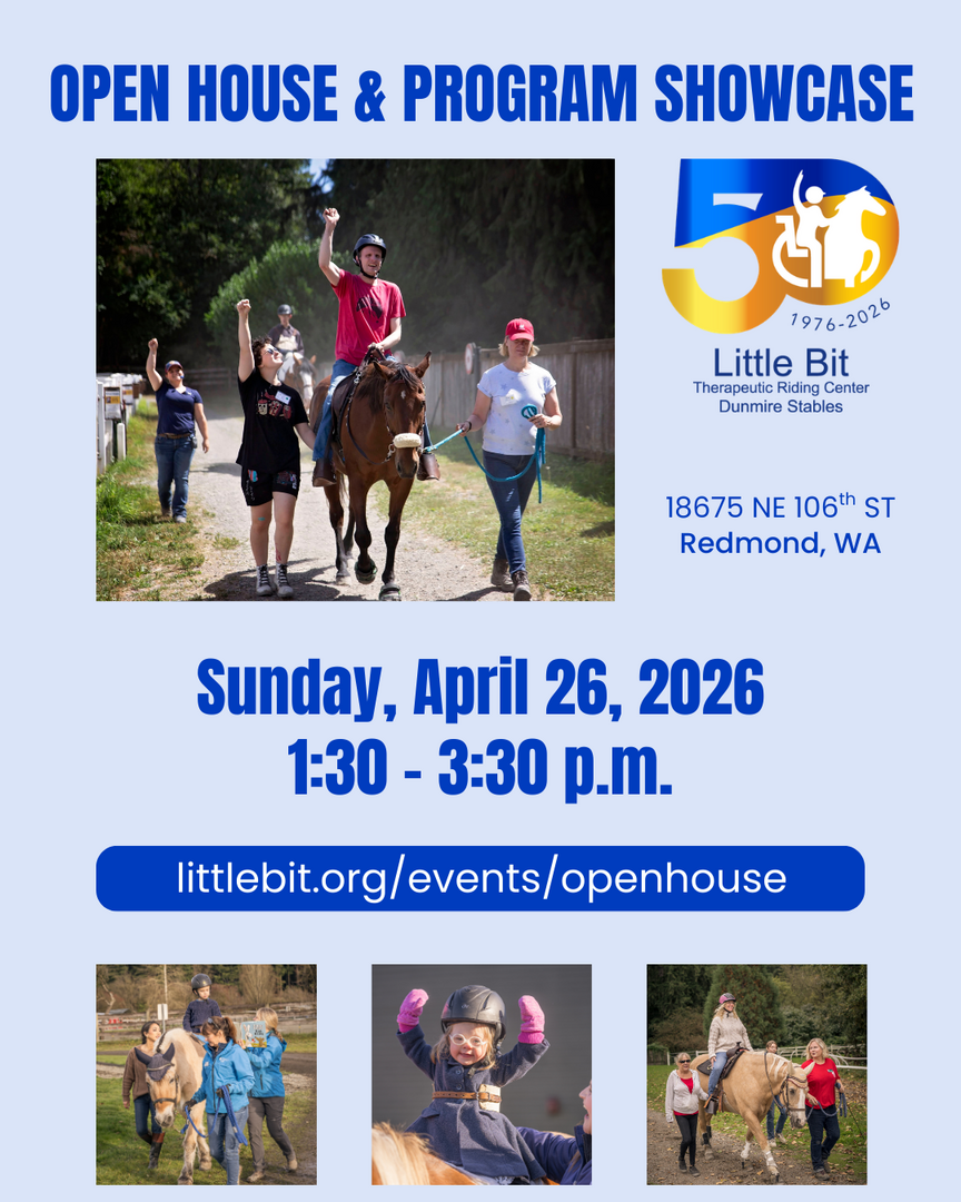 Please join us at Little Bit on Sunday, April 26 for an Open House and Program Showcase, 1:30-3:30 p.m. This is an opportunity for the community to learn about Little Bit’s mission, programs, and the people we serve, and help celebrate Little Bit’s 50th anniversary. The event will include program demonstrations, a guided tour, and a photo opportunity with a Little Bit horse! Learn more at www.littlebit.org/events/openhouse. RSVP not required.