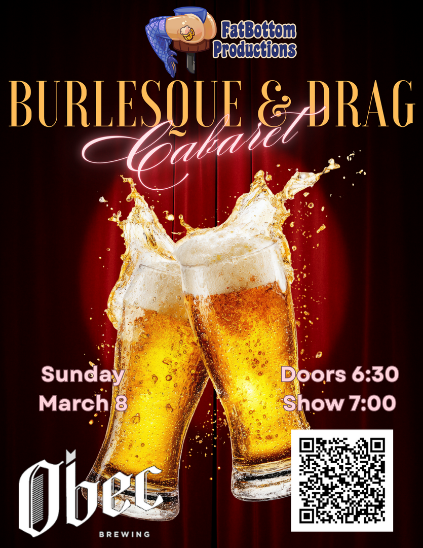 Starting Sunday, March 8, Fat Bottom Productions will be taking over the event space at Obec for a drag and burlesque show. We'll return on April 5 and the first Sunday each month after. Fat Bottom Productions is known for bringing great performers to the stage. You'll see iconic performances from local and traveling drag and burlesque artists.