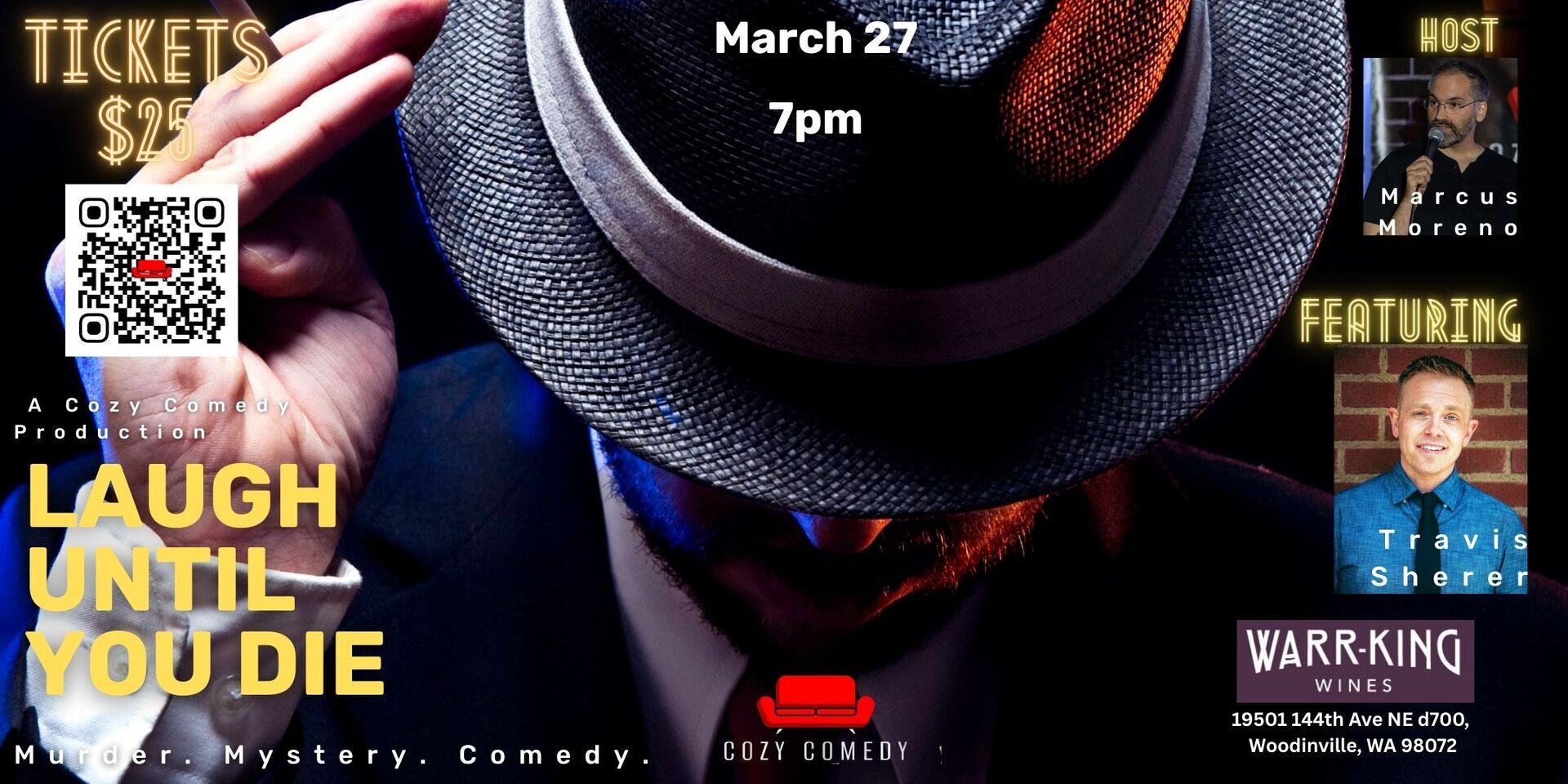You should nab tickets to this unique event while you can! Warr-King Wines has partnered with Cozy Comedy to bring you a unique Murder Mystery Comedy Experience! YOU might be the killer! Your friends and family might be! Hosted by comedians Marcus Moreno & Travis Sherer, Laugh Until You Die is a 50-player Murder Mystery Comedy experience where anyone in the audience may be responsible for a little bit of murder (but not really)! A brief tutorial and ongoing audience guidance means that anyone can hop into the experience and enjoy! This is an amazing date night experience or an awesome evening of entertainment for friends and family!
