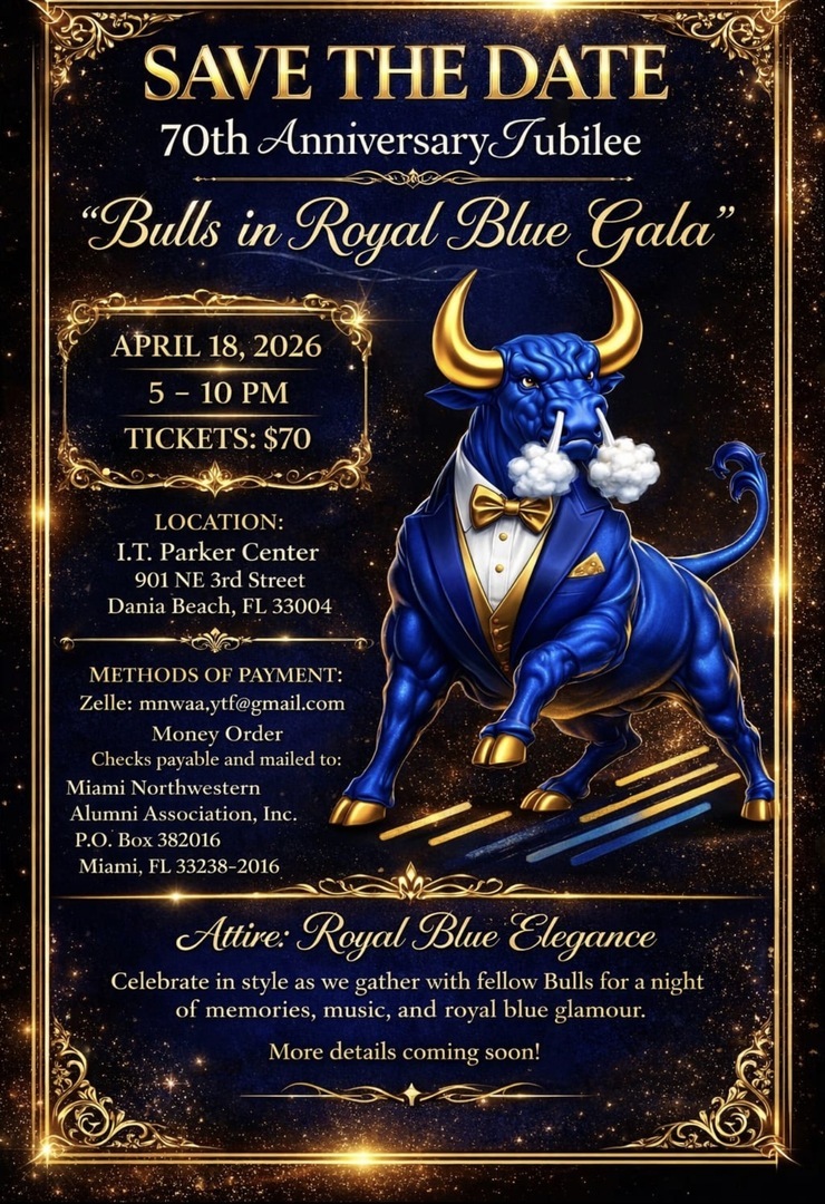 HomeEvents70th Anniversary Jubilee – “Bulls in Royal Blue Gala!” 70th Anniversary Jubilee – “Bulls in Royal Blue Gala!” Saturday, April 18, 2026 5:00 PM - 10:00 PM 5:00 PM - 10:00 PM See all dates and Times I T Parker Center Parking Deals Get a Ride LYFT UBER Add to Calendar 04/18/2026 05:00 PM 04/18/2026 10:00 PM America/Atikokan 70th Anniversary Jubilee – “Bulls in Royal Blue Gala!” 70th Anniversary JubileeEvent LinksTickets: https://go.evvnt.com/3494125-0 Details & Tickets: https://www.upcomingevents.com/south-florida/events/i-t-parker-center/70th-anniversary-jubilee-bulls-in-royal-blue-gala-606021?ref=uceaddevent I T Parker Center, 901 Northeast 3rd Street, Dania Beach, FL, 33004 Set Reminder Categories Charities, Good For Families, Kids & Family, Neighborhood Neighborhoods Edgewood (Fort Lauderdale)Liberia (Hollywood)North Beach (Hollywood)Poinciana Park (Fort Lauderdale) 70th Anniversary JubileeEvent LinksTickets: https://go.evvnt.com/3494125-0