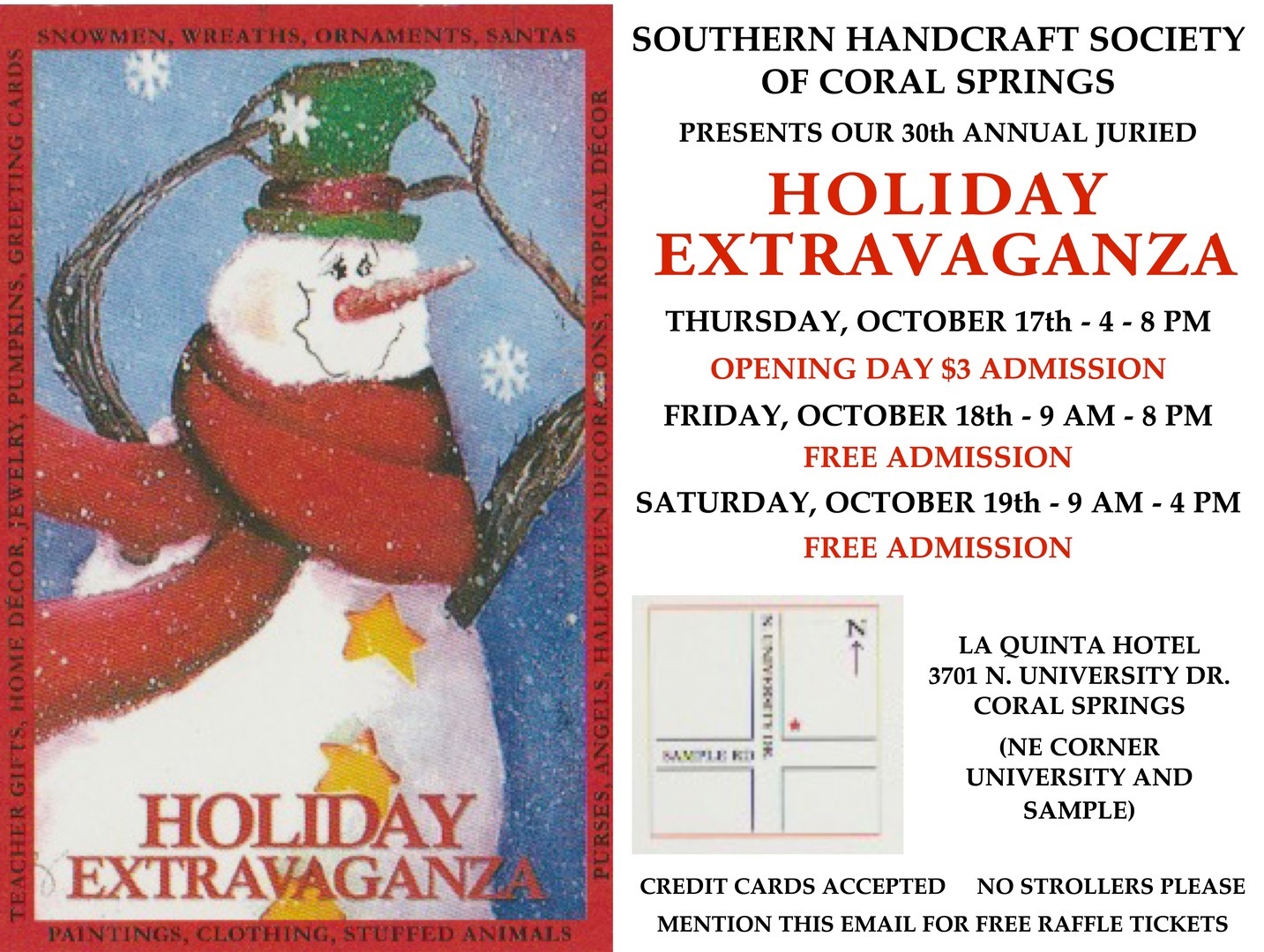 The Coral Springs Chapter of Southern Handcraft Society will hold its 30th Annual “Holiday Extravaganza” on Thursday, Oct. 17th from 4 pm - 8 pm; Friday, Oct. 18th from 9 am-8 pm and Saturday, Oct. 19th from 9 am-4 pm at La Quinta Hotel, 3701 N. University Drive, Coral Springs, FL, 33065.