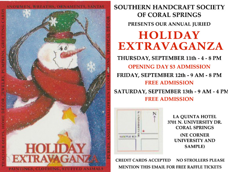 The Coral Springs Chapter of the Southern Handcraft Society will hold their 31st annual “Holiday Extravaganza” on September 11th from 4 pm – 8 pm; Friday, September 12th from 9 am – 8 pm and Saturday, September 13th from 9 am – 4 pm at La Quinta Inn and Suites, 3701 N. University Drive, Coral Springs, FL 33065. Admission for the preview show on Thursday is $3.00. No charge for show on Friday and Saturday.