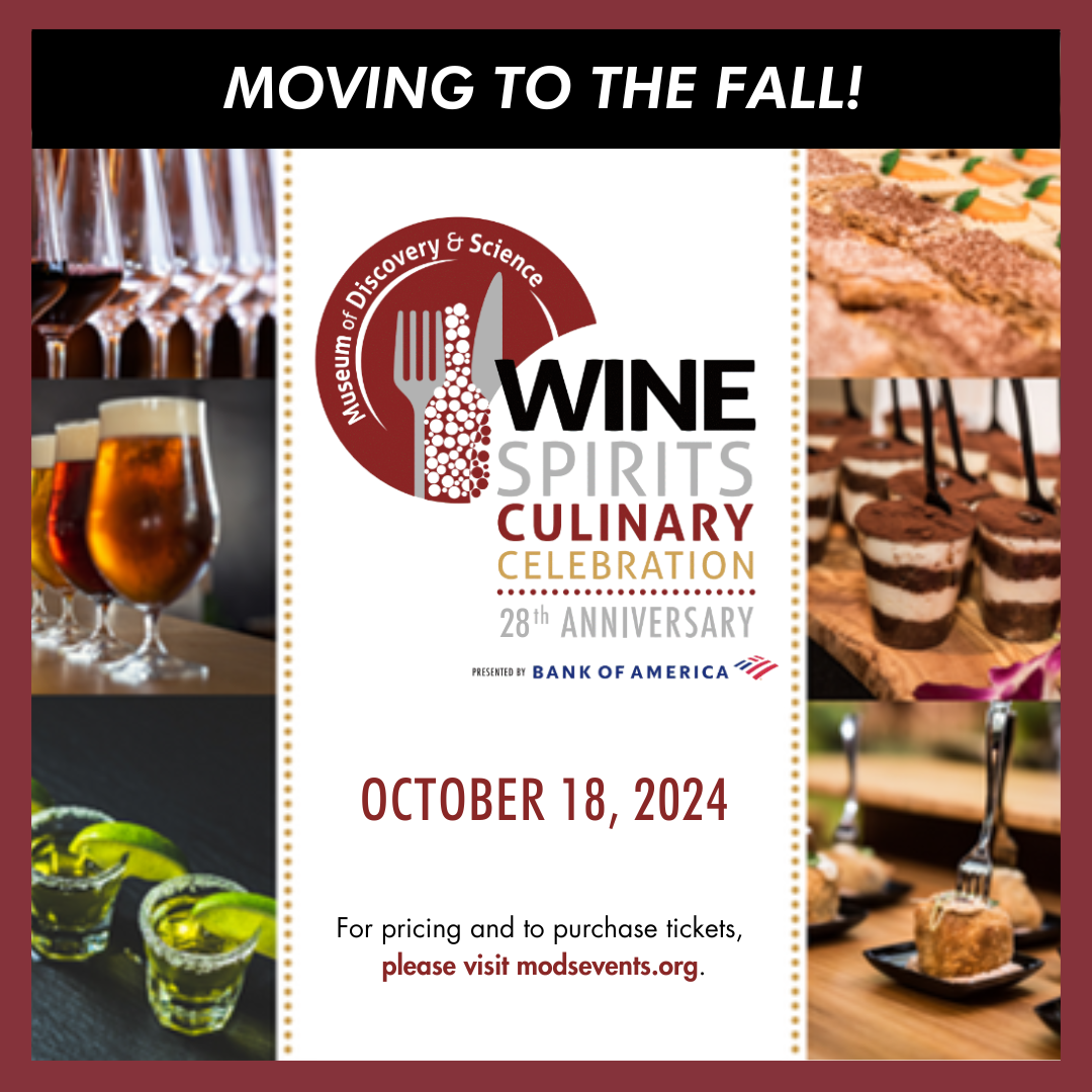 The 28th anniversary Bank of America Wine, Spirits & Culinary Celebration, Downtown Fort Lauderdale’s premier gourmet fundraiser, moves to Friday, October 18, from 5:30 p.m. to 10 p.m. at the Museum of Discovery and Science (MODS). It’s a banner year for fine food and spirits as gastronomes and philanthropists will have an opportunity to enjoy the best of South Florida’s restaurants and international spirits during this epicurean evening to benefit MODS’ mission of connecting people to inspiring science.