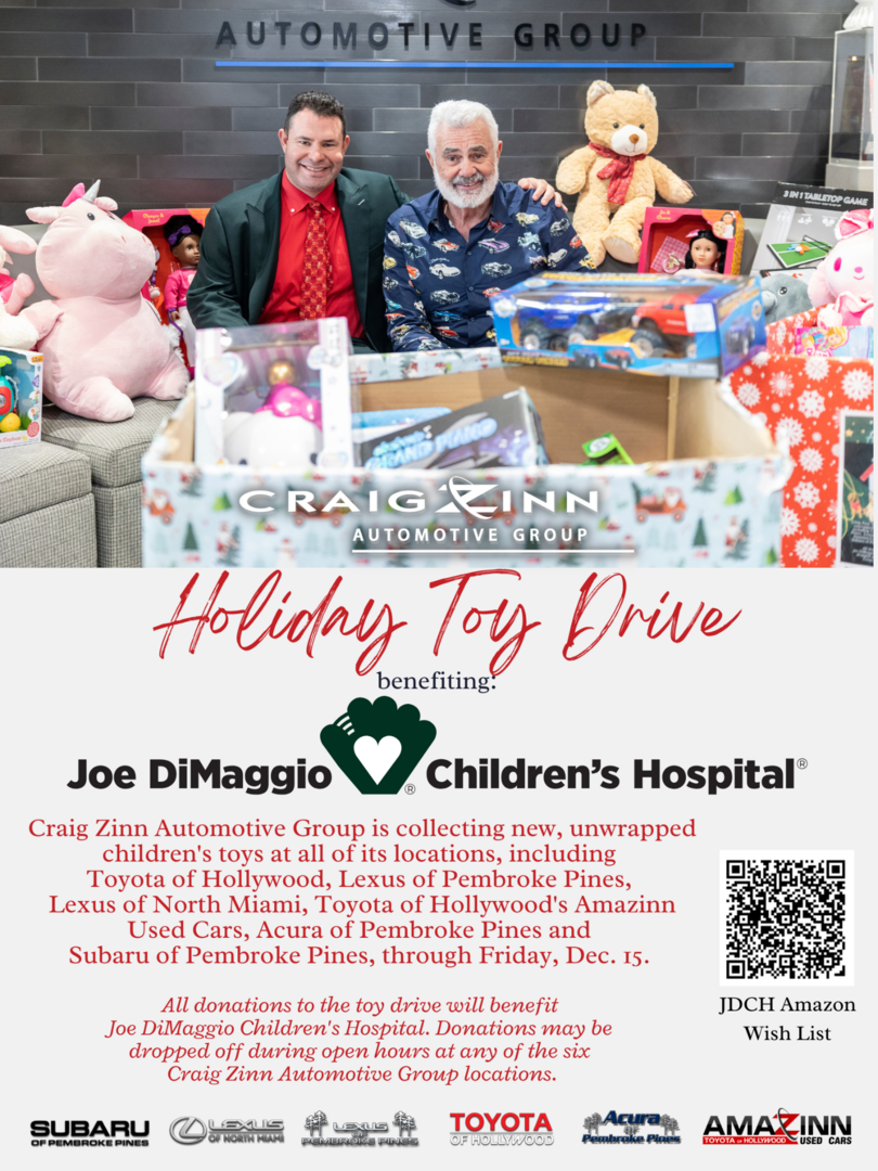 The holiday toy drive is one of many Joe DiMaggio Children's Hospital initiatives supported by Craig Zinn Automotive Group to make the community a better place for all. Craig Zinn Automotive Group remains dedicated to supporting Joe DiMaggio Children's Hospital and the work it does to save the lives of children, regardless of age or medical complexity.