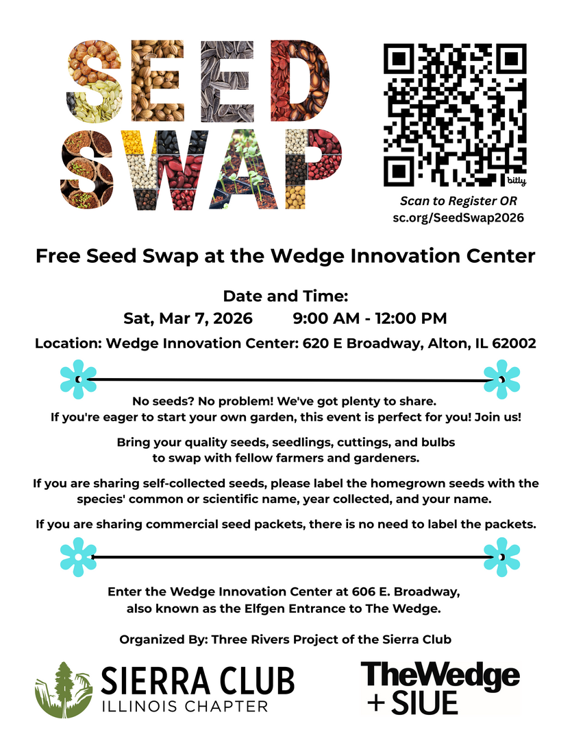 Sierra Club Illinois’ Three Rivers Project to host a Winter Seed Swap in Downtown Alton! Wedge Innovation Center in Alton on Saturday, March 7, from 9:00 AM to 12:00 PM, located at 606 E. Broadway, also known as the Elfgen Entrance to The Wedge, Conference Room 401. If you are sharing self-collected seeds, please label the homegrown seeds with the common or species name, year, and your name. If you are sharing commercial seed packets, there is no need to label the packets. No seeds? No problem! We've got plenty to share. To register for the Seed Swap, visit sc.org/SeedSwap2026. Registration is not mandatory, but it helps the organizers plan the event.