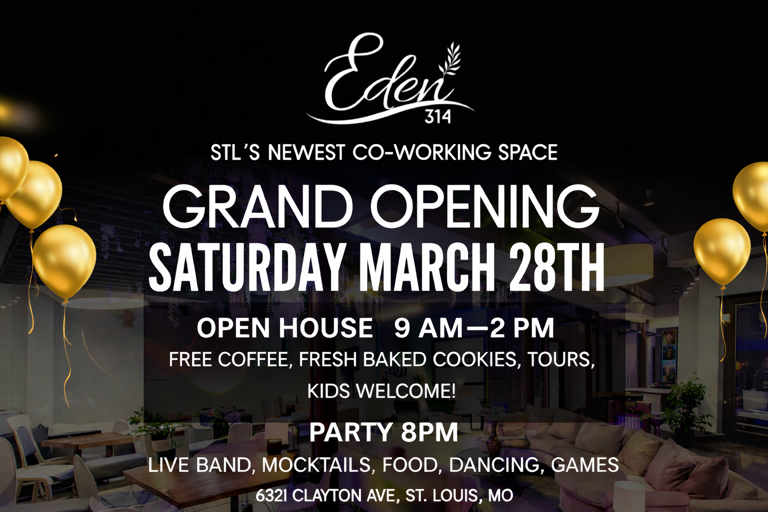 Eden 314 Announces Grand Opening of St. Louis’ Newest Co-Working and Family-Friendly Community Space on March 28. From 9 AM-2 PM, There Will Be Free Coffee and Fresh-Baked Cookies, and Kids Are Welcome. Adults Can Come Back at 8 PM, Live Music From The Drew Project Band, Delicious Bites, Mocktails, and Games.