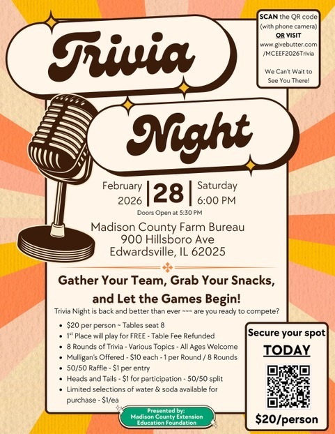 Join us on Saturday, February 28, 2026, for a Trivia Night at the Madison County Farm Bureau in Edwardsville to raise funds for the Madison County University of Illinois programming, including 4-H, Master Gardeners, and Master Naturalists.