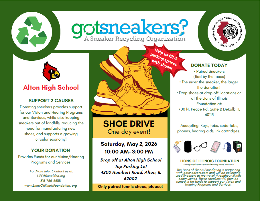 One day Tennis Shoe Recycling Event hosted in collaboration with the Lions of Illinois Association. Drive through the Alton High Parking Lot on Saturday, May 2nd from 10 am to 3 pm to drop off used paired tennis shoes. Nicer shoes are repaired and put back into use and less desirable shoes are recycled into usable product. Proceeds from this event benefit the hearing or vision impairment camps.