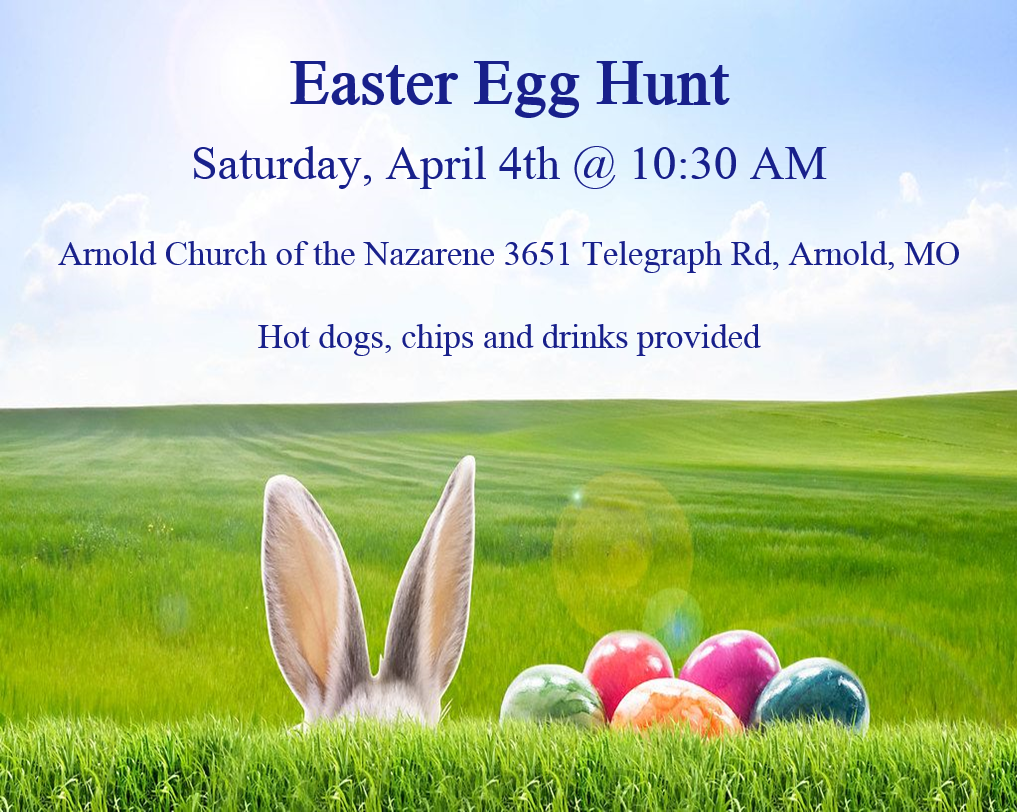 HomeEventsEaster Egg Hunt Easter Egg Hunt Saturday, April 04, 2026 10:30 AM - 12:00 PM 10:30 AM - 12:00 PM See all dates and Times Arnold Church of the Nazarene Parking Deals Get a Ride LYFT UBER Add to Calendar 04/04/2026 10:30 AM 04/04/2026 12:00 PM America/Atikokan Easter Egg Hunt Family event for children birth to 12 years old. Hot dogs, chips and drinks provided. Details & Tickets: https://www.upcomingevents.com/st-louis/events/arnold-church-of-the-nazarene/easter-egg-hunt-622900?ref=uceaddevent Arnold Church of the Nazarene, 3651 Telegraph Road, Arnold, MO, 63010 Set Reminder Categories Fundraising & Charity, Good For Families, Kid-Friendly, Kids & Family, Neighborhood Family event for children birth to 12 years old. Hot dogs, chips and drinks provided.